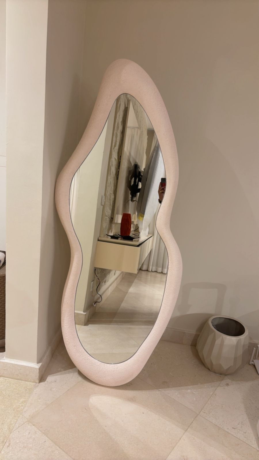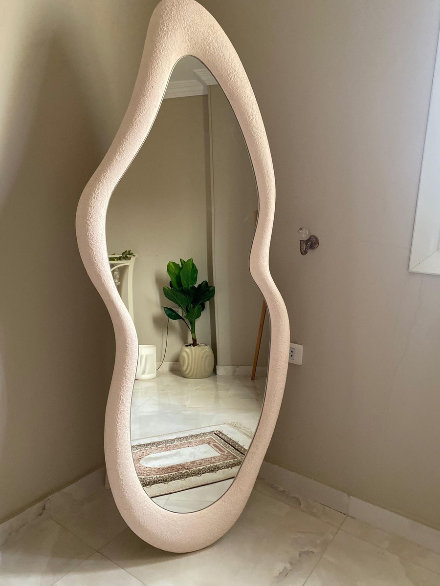 مرآة بتصميم عضوي انسيابي مستوحى من الطبيعة، بخطوط غير منتظمة بتكسر الشكل التقليدي وبتدي إحساس بالحركة والنعومة في نفس الوقت.