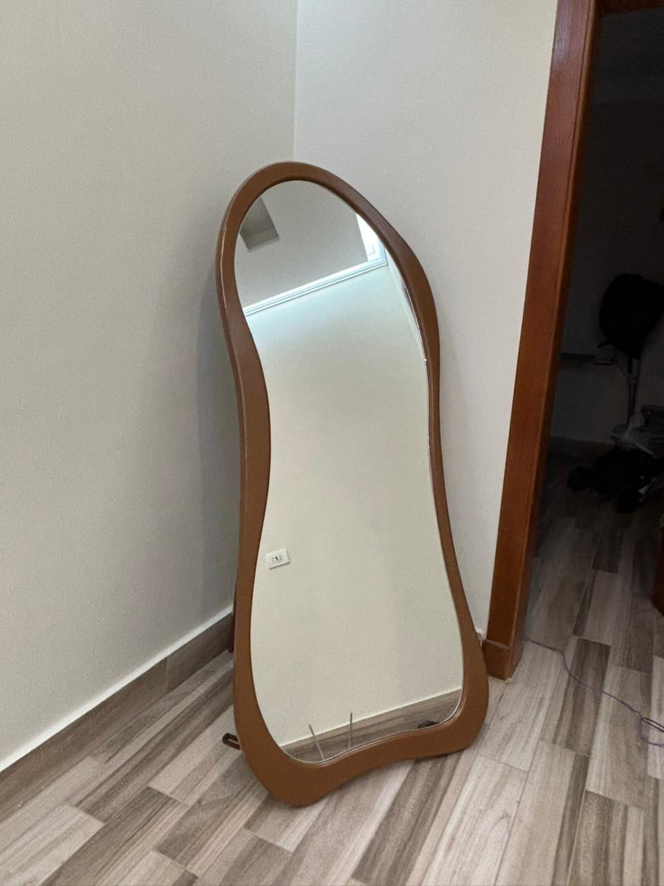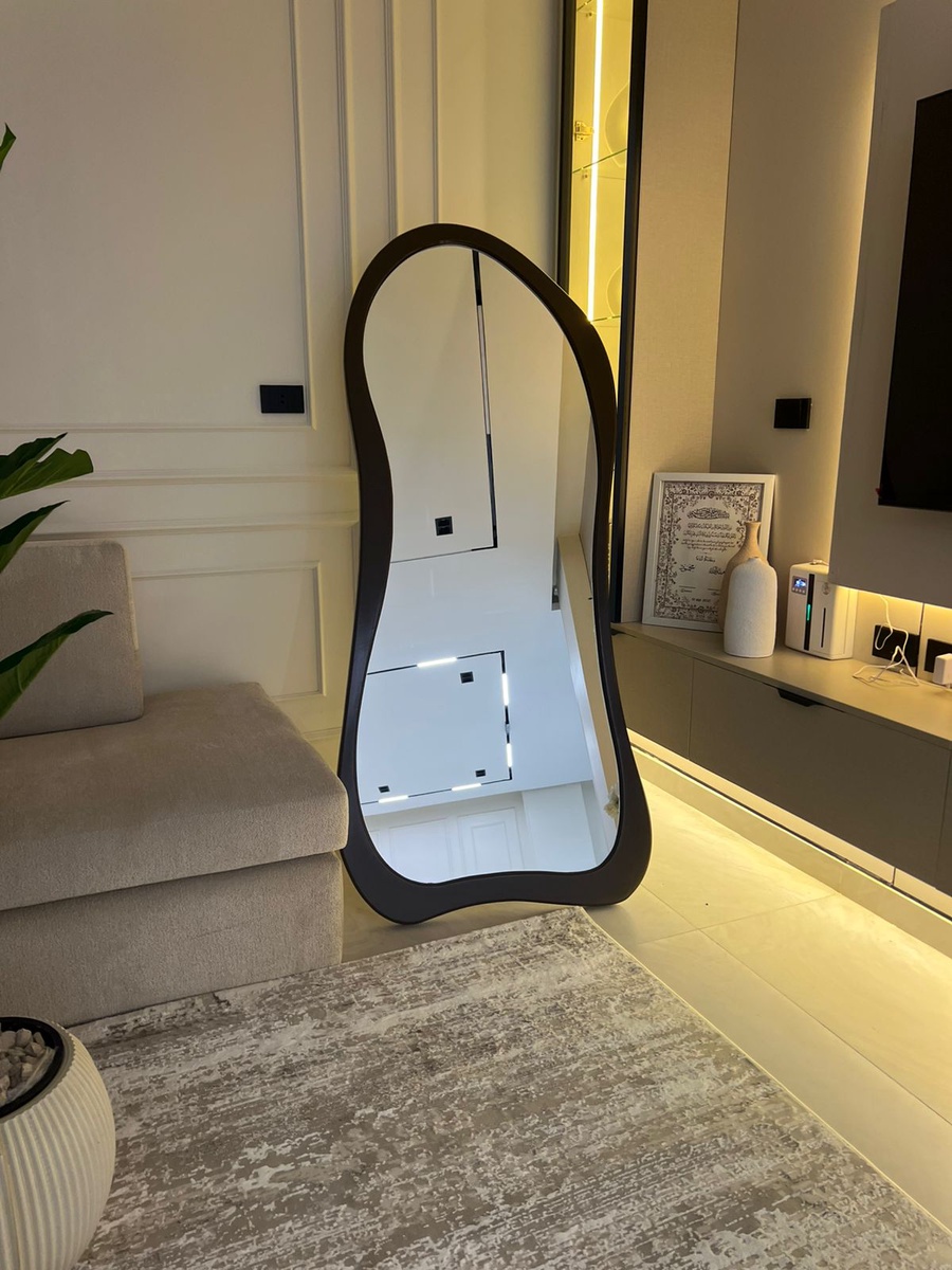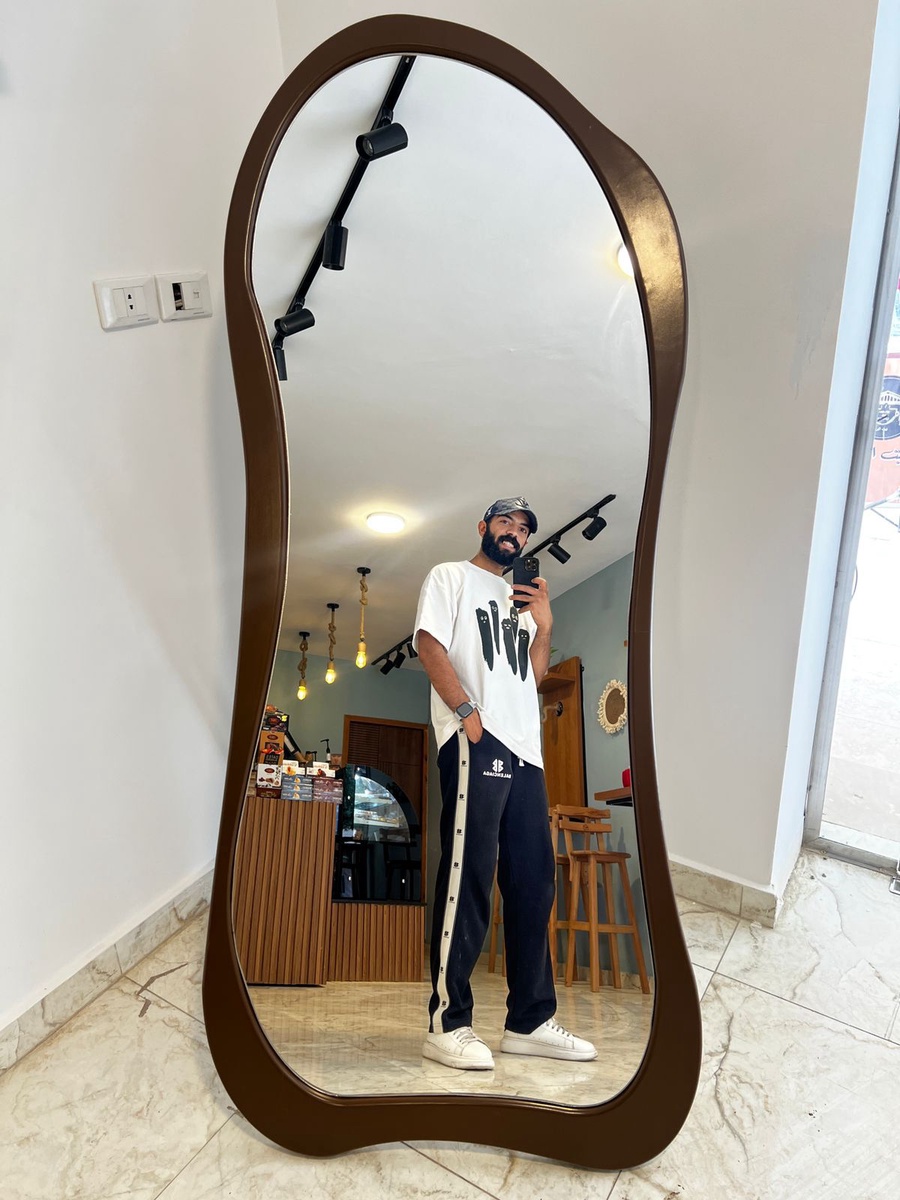مرآة بتصميم عضوي انسيابي مع إطار بني عميق يضيف إحساس بالدفء والراحة، ويخلق جو Cozy أنيق يناسب البيوت العصرية والكافيهات والبوتيكات.